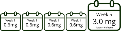 Vanaf week vijf gebruik je de volledige onderhoudsdosering van 3,0 mg per dag. Bij deze dosering is één pen na ongeveer zes dagen op. Dat is normaal en volledig in lijn met hoe de behandeling is opgebouwd. In de praktijk betekent dit dat je in de tweede behandelmaand vijf pennen per maand nodig hebt om de 3,0 mg dagdosering vol te houden. Goodweigh levert die maandelijks automatisch, zodat je behandeling ononderbroken kan doorlopen.